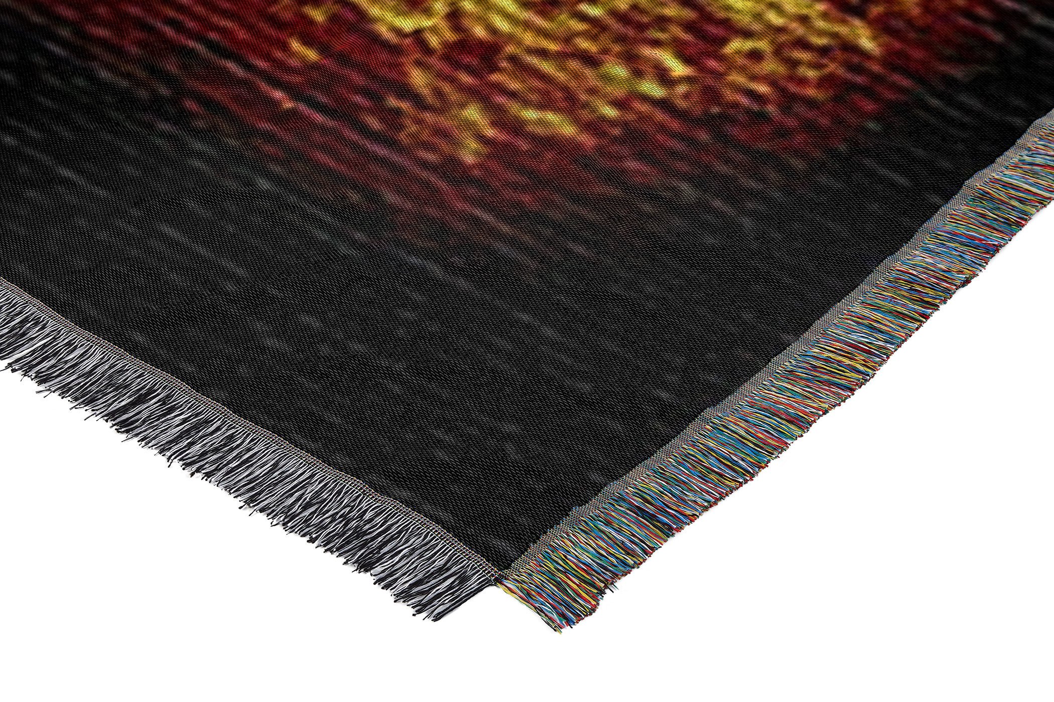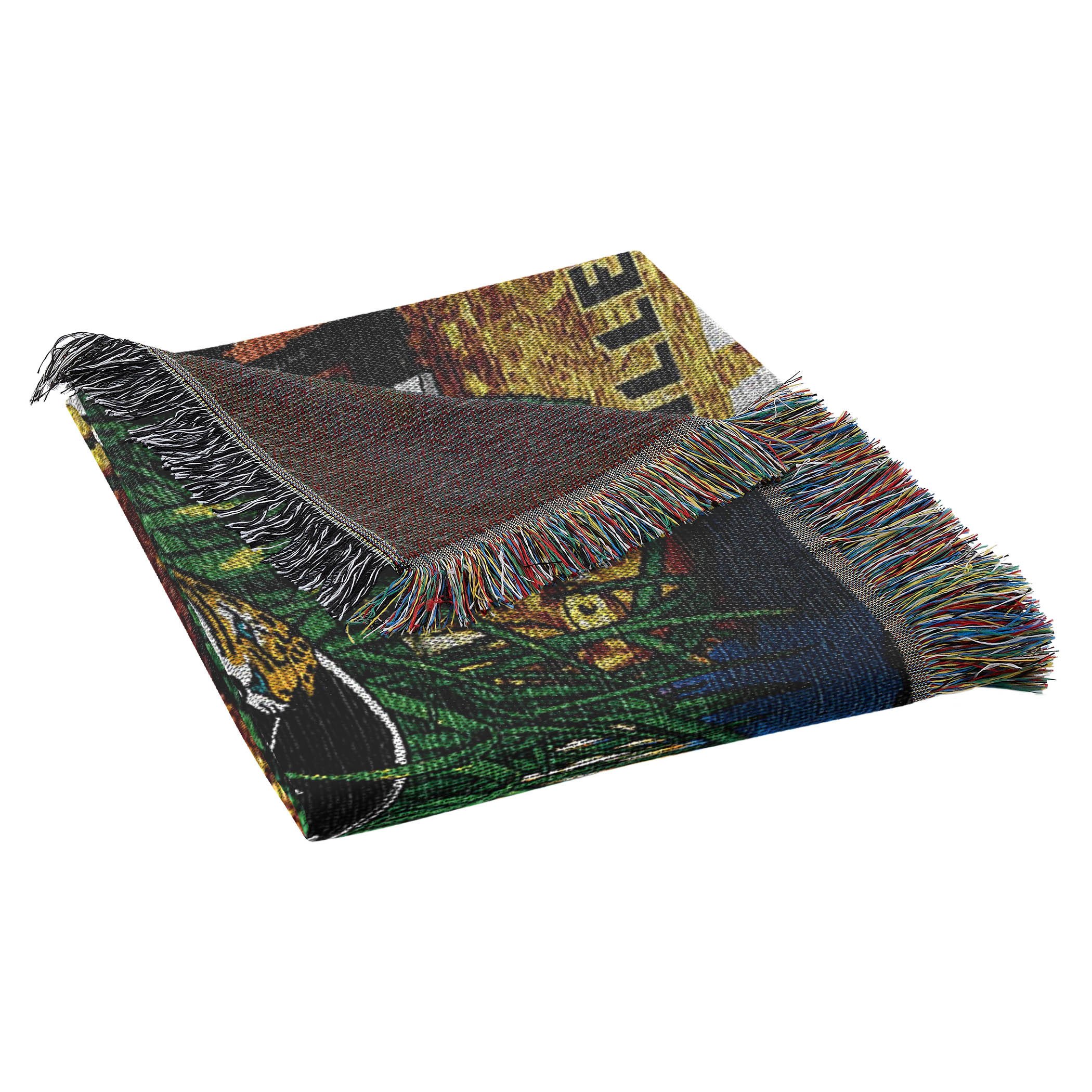 Detailed, woven tapestry; decorative fringes around all edges; made in America