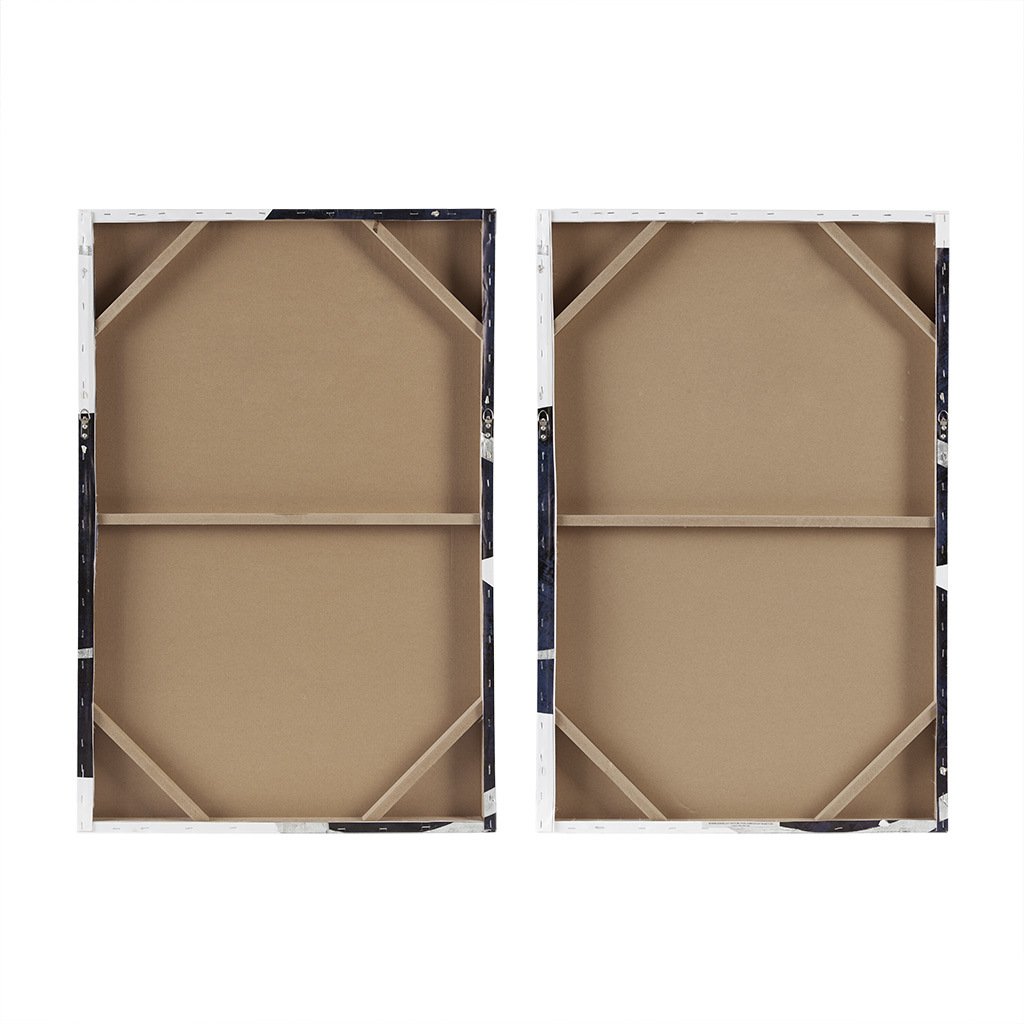 Make a statement in any room with the INK+IVY Celestial Orbit Navy by Artist Hutton. A striking abstract design of deep navy hues and silver metallic foiling stone shapes stand bold against a white background. The gel coating creates a glossy finish, while an MDF backing provides structure and support. Featuring 2 D-rings on the reverse of each piece, easily display this abstract piece in your living room or bedroom to add sleek and modern appeal to your decor. Spot clean only, this art set comes with 2 pieces with each piece measuring 24x36."